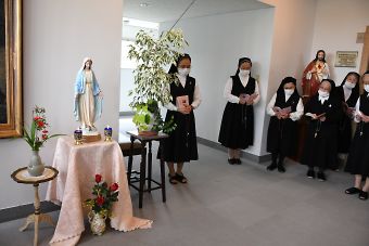 | ① 修道院玄関:聖母マリア像の前でロザリオ1~2 連と聖歌♬! ~行列~ | |