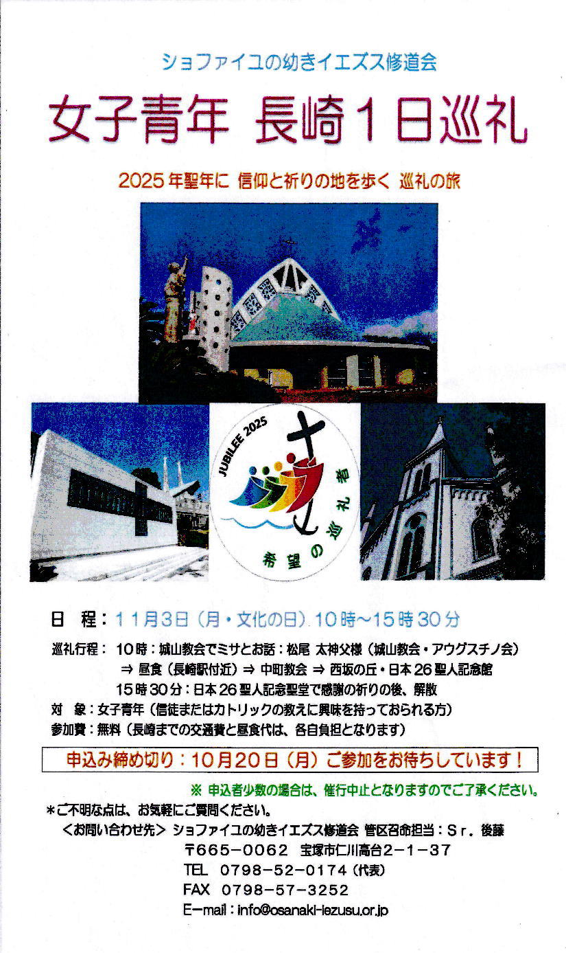 女子青年 長崎 一日巡礼 ご案内! 多くの方の参加をお待ちしております。 |